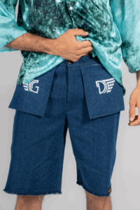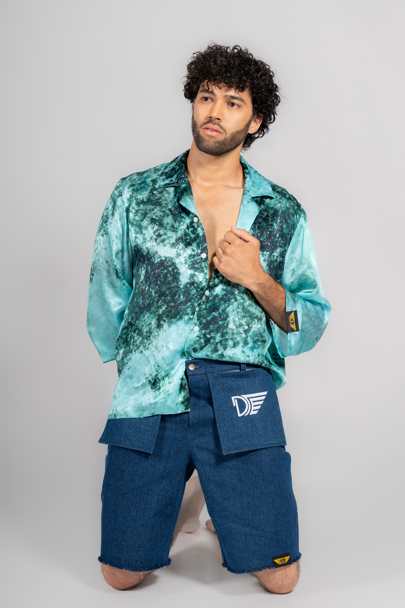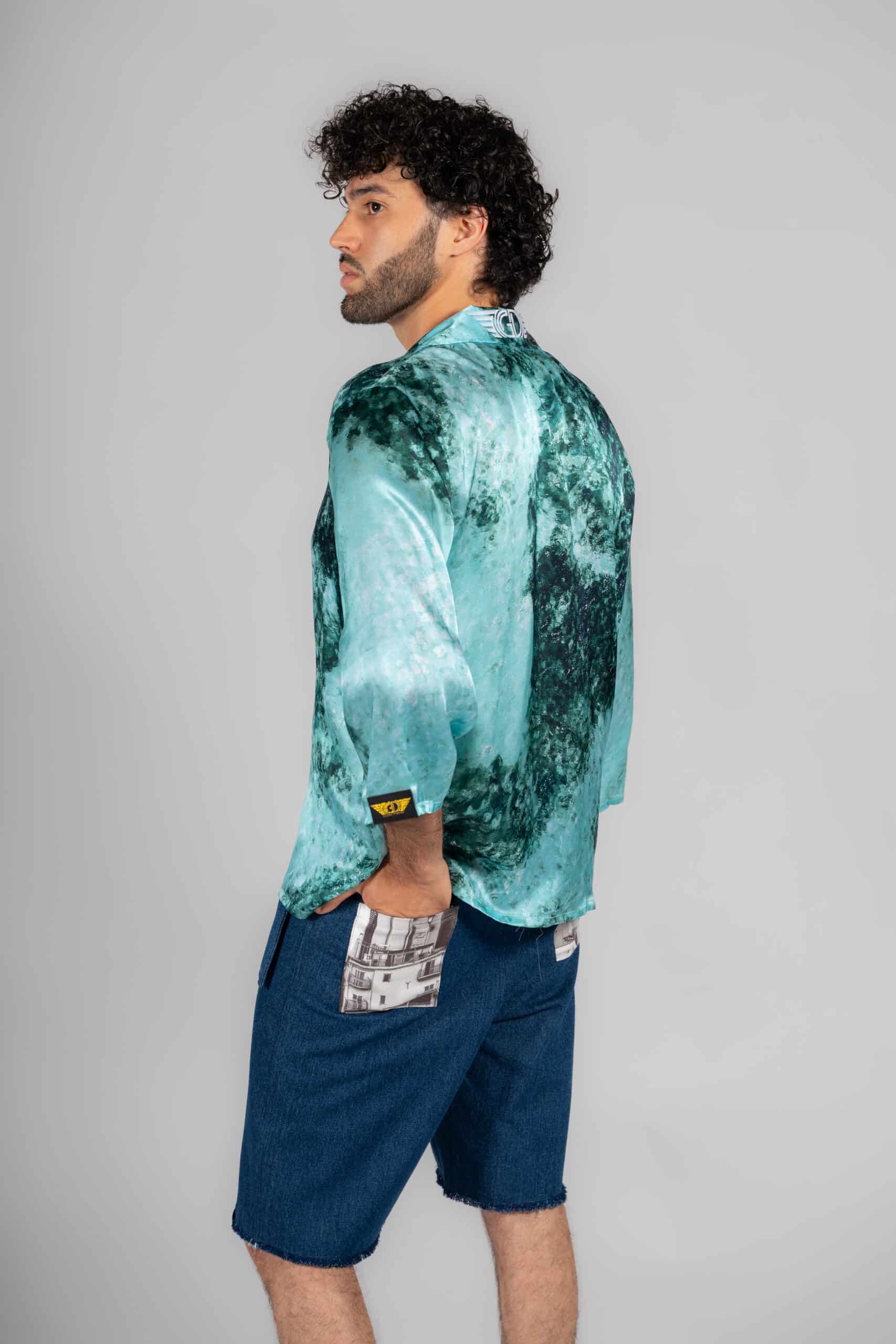 Un pantaloncino costume con stampa marina realistica, realizzato con tessuti riciclati per un look sostenibile, comodo e di tendenza.